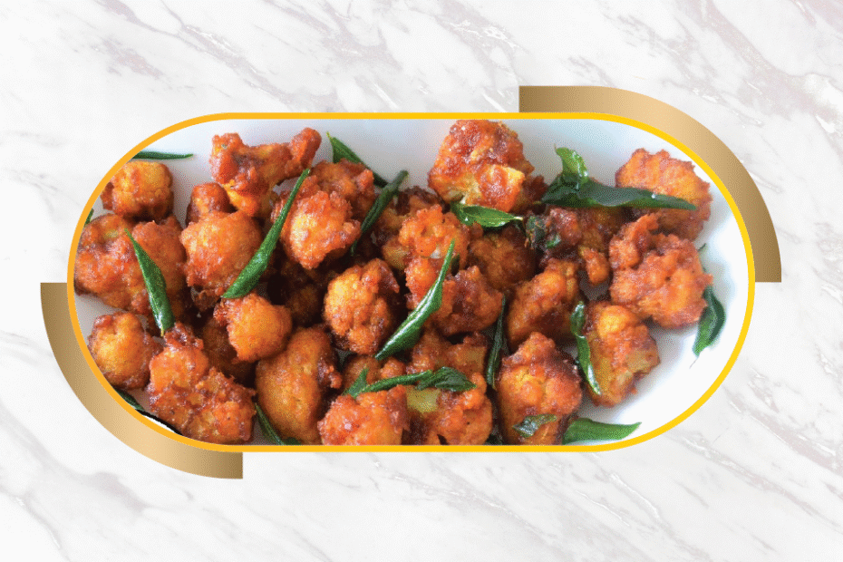 Batter fried cauliflower temper with mustard seed cumin seed curry leaves and spices finish with yogurt garnish with chopped cilantro.