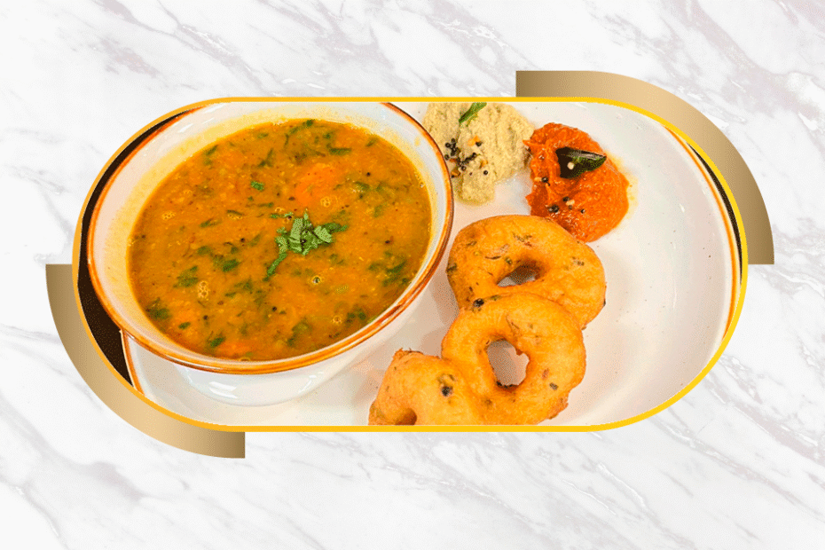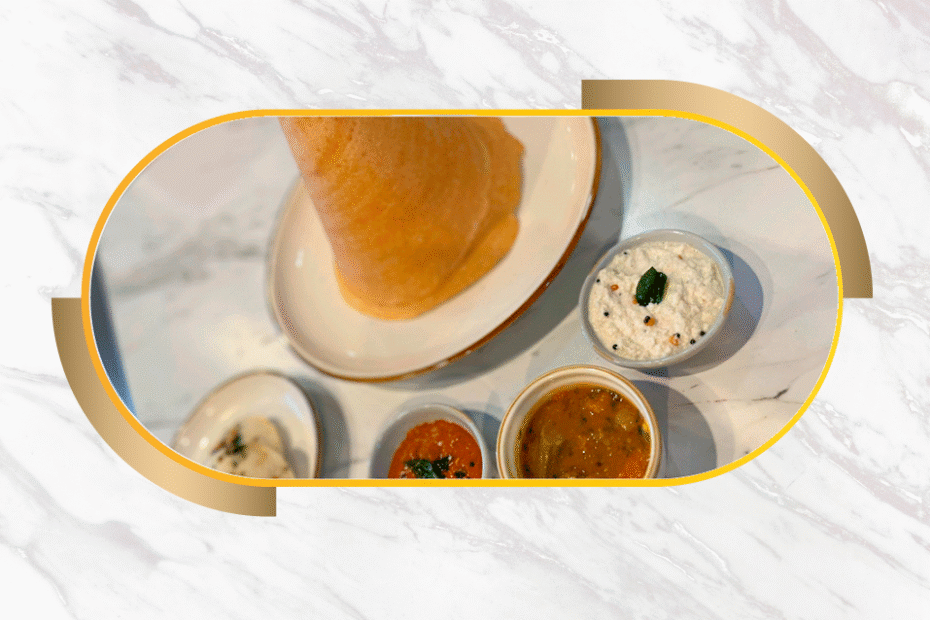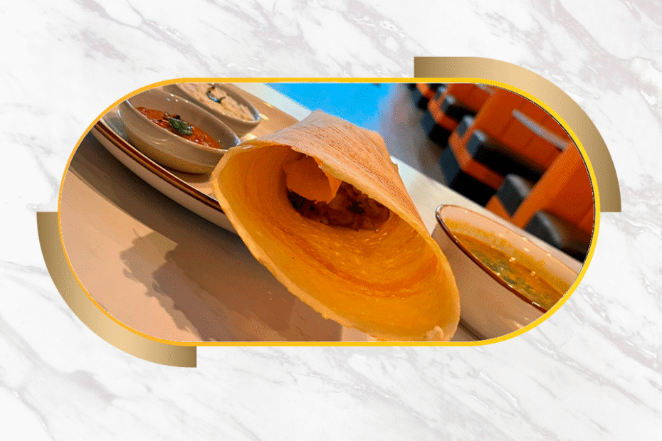 Crispy rice crepe filled with spiced potato masala, served with chutney and sambar.